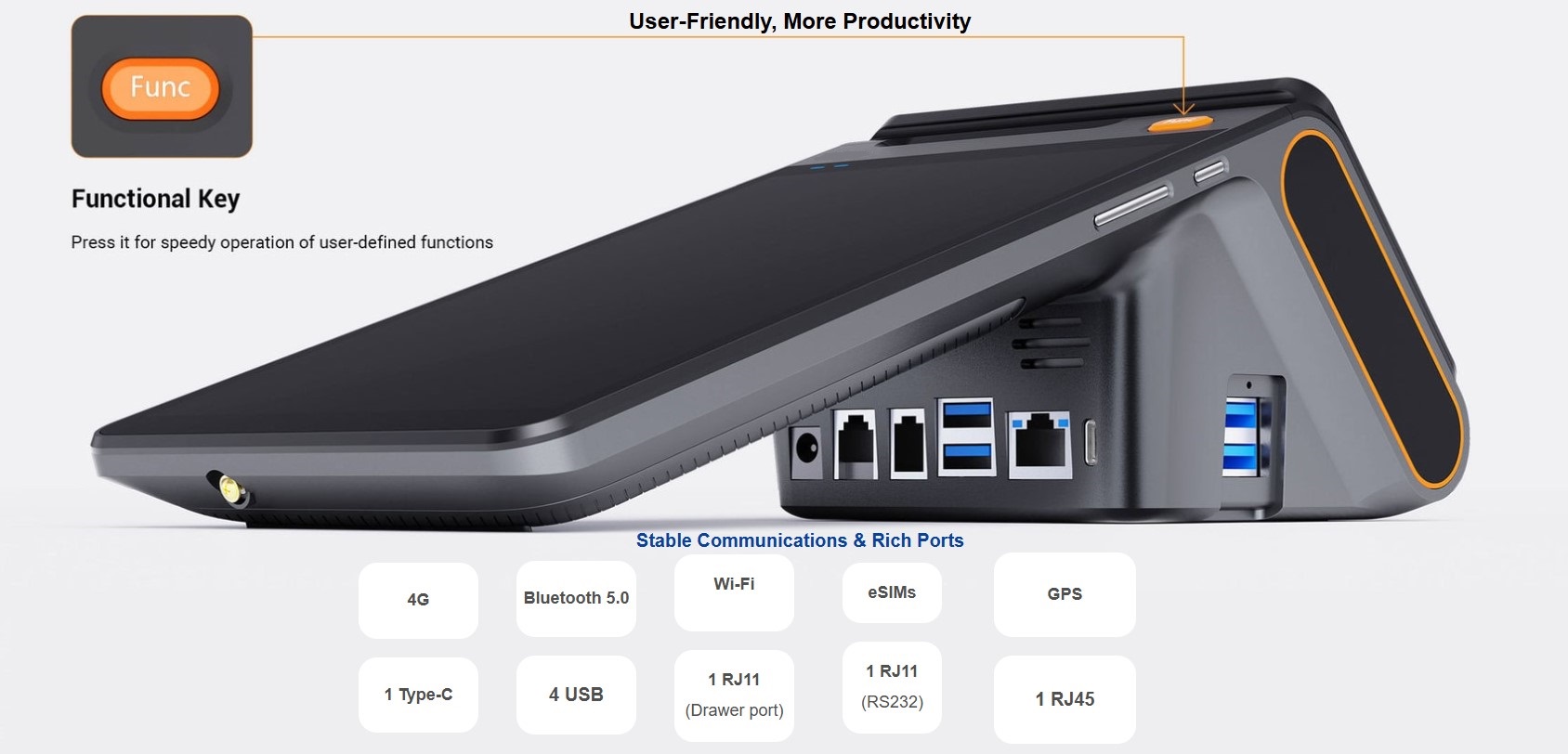 - Rýchla tlač: 58 mm vysokorýchlostná termálna tlačiareň s rýchlosťou tlače 80 mm/s, podporný štítok, účtenka, webová stránka, BT a ESC POS tlač